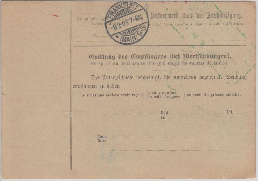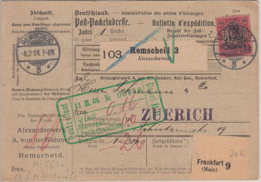 Firmenlochung "AvdN" (Alexander von der Nahmer, Maschinen f. Fleischbetriebe) - Selbstbucher Paketzettel Alexanderwerk