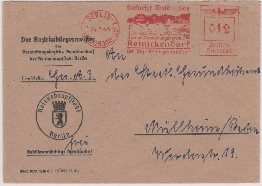 DR - Berlin-Reinickendorf-Ost 1943, 12 Pfg. AFS a. Dienstbrief n. Müllheim