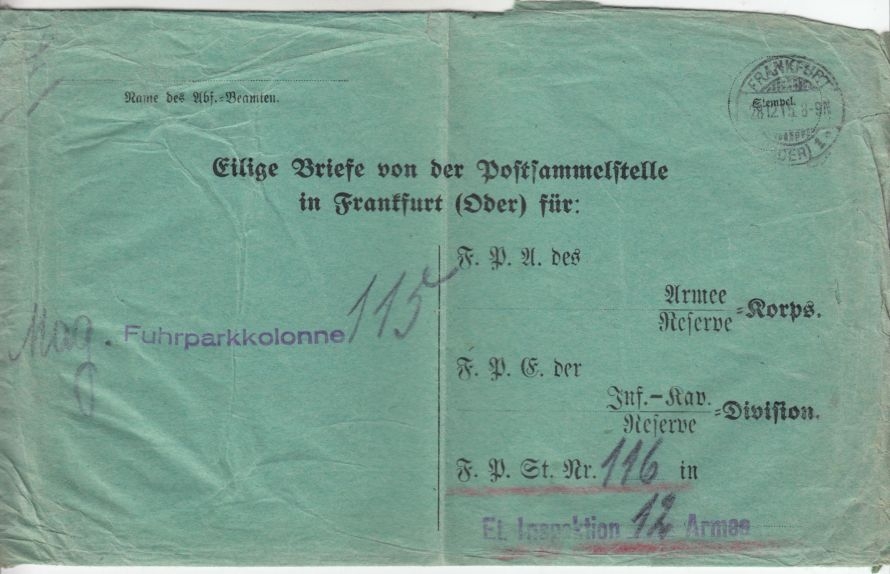 Feldpoststation Nr. 116 (Et.Insp. 12. Armee" - sehr seltenes Vordruckkuvert - starke Alters- bzw. Beförderungsspuren