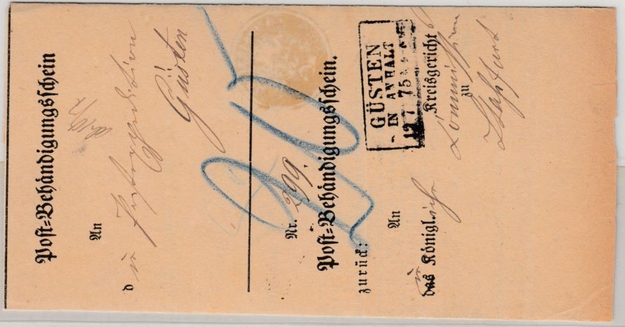 DR - Güsten in Anhalt 1875, Ra3 a. Post-Behändigungsschein v. Staßfurt
