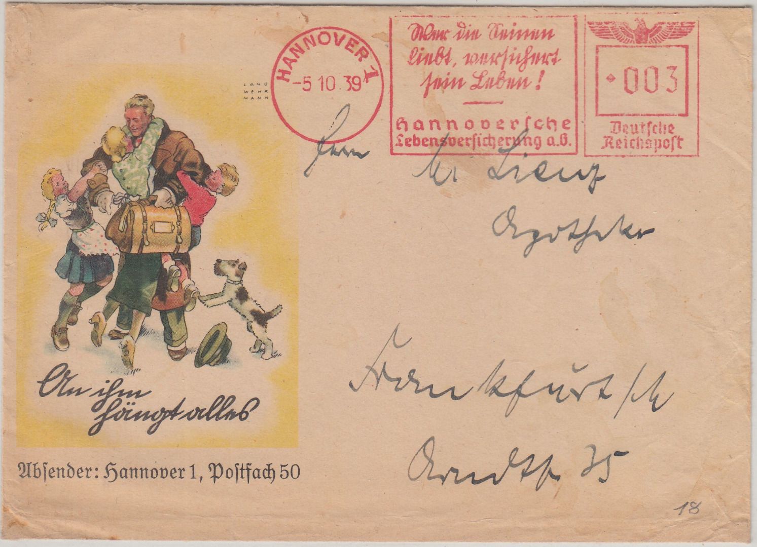 gelaufen nach Frankfurt a/M. - kleine Alters-/Bedarfsspuren - "Wer die Seinen liebt, versichert sein Leben" (ca. 1 Monat nach Kriegsbeginn sicherlich naheliegend)
