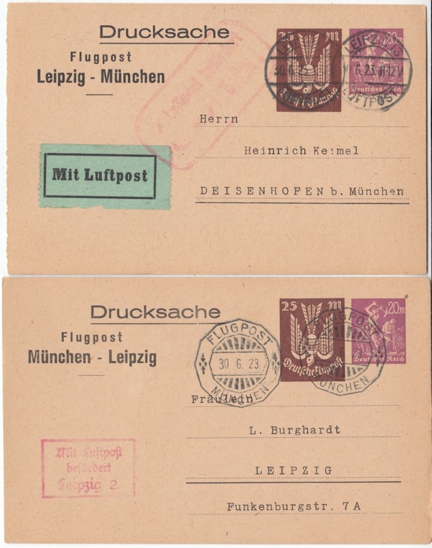 DR-Infla - 20+25 M. Flugpost-Drucks.-GA-Karte München-Leipzig, Leipzig-München