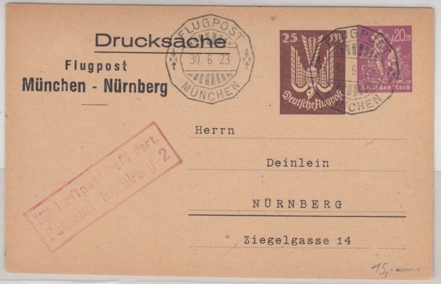 DR-Infla - 20+25 M. Flugpost-Drucks.-GA-Karte München - Nürnberg 1923