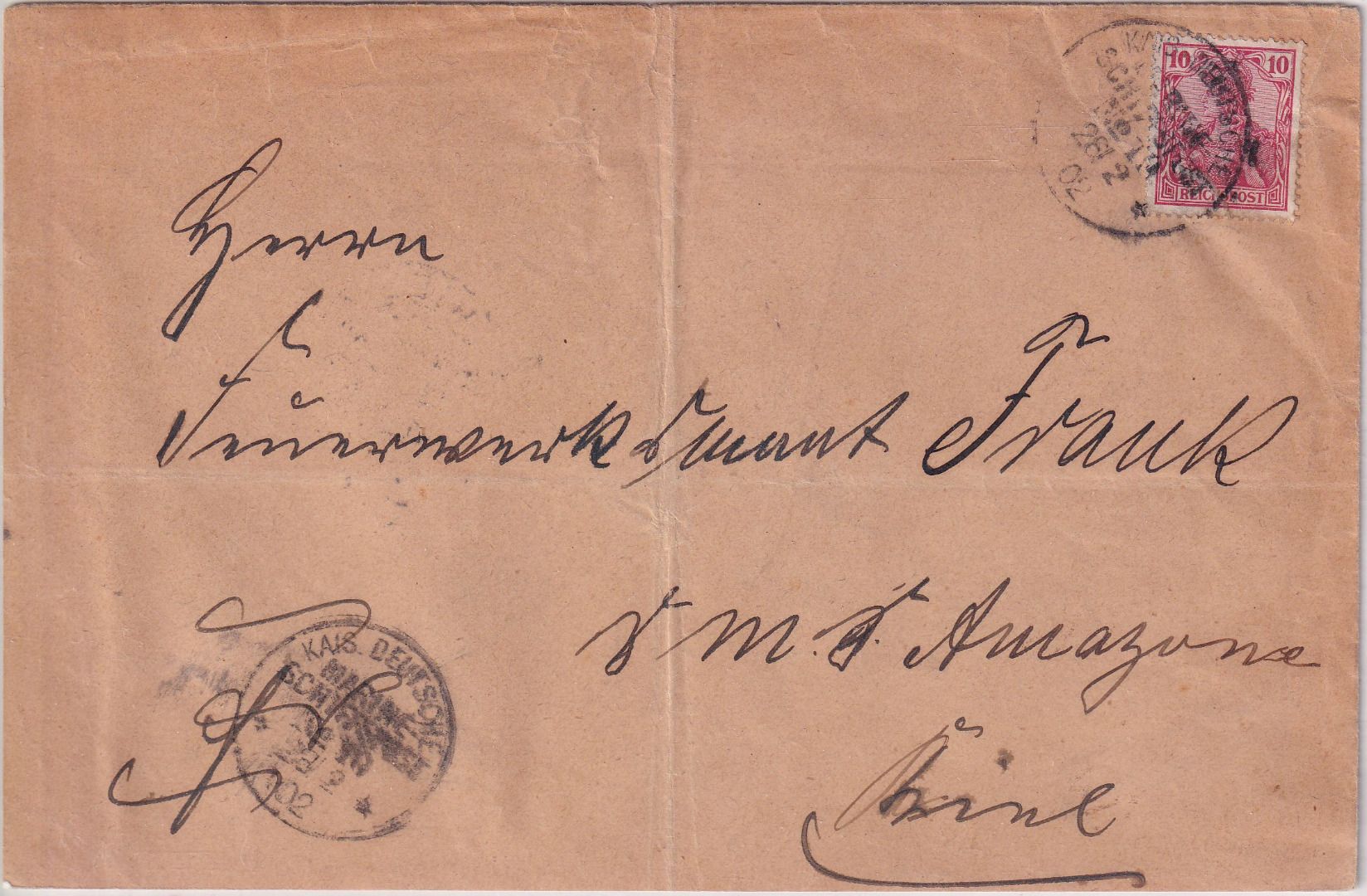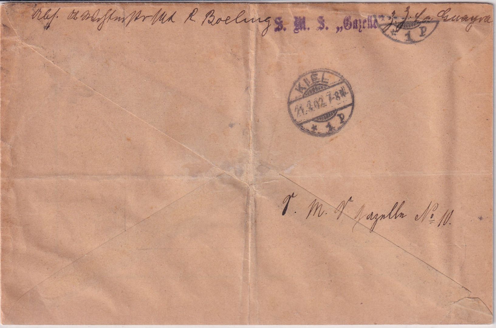3.2. bis 9.10.1902 Pendelreise in der Karibik (Adressangabe La Guayra/VENEZUELA) - Kuvert mit Karton verstärkt und verschlossen - adr. an ein Bestzungsmitglied auf der SMS Amazone (kl. Kreuzer) - ohne Inhalt