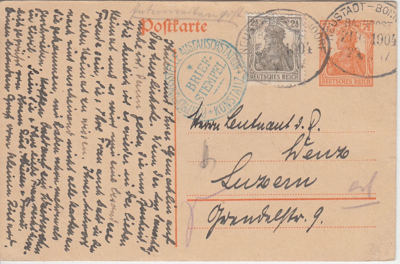 gelaufen v. Münchingen (bei Bonndorf) n. Luzern - Zensurstempel Austauschstation Konstanz - Marke Aufklebeknitter