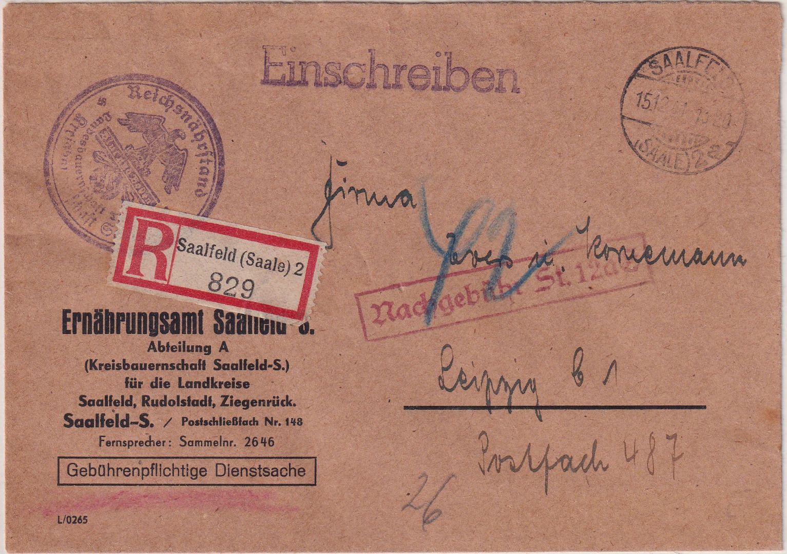 gelaufen n. Leipzig - Vordruckkuvert "Ernährungsamt" - ohne Inhalt