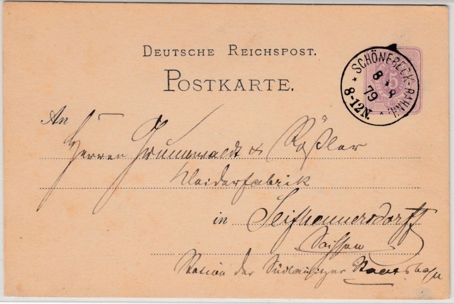 DR - Schönebeck-Bahnh. 1879, kl. K1 a. 5 Pfg. GA-Karte n. Seifhennersdorf
