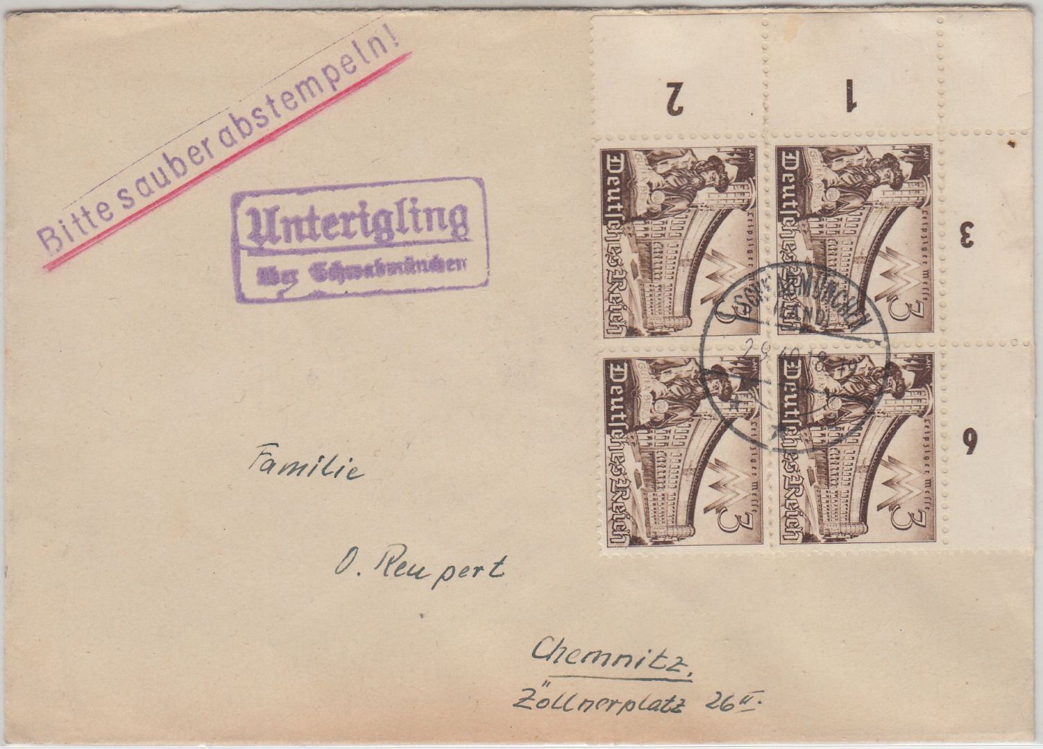 DR - Unterigling ü. Schwabmünchen Landpost-Ra2 Brief n. Chemnitz 1940