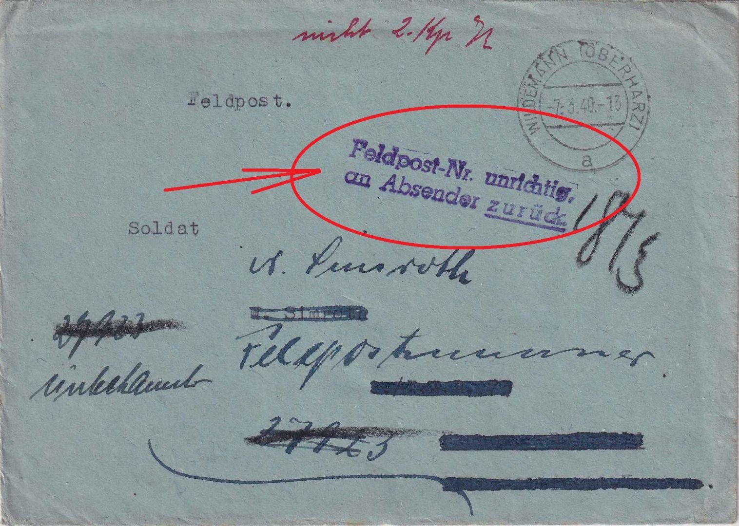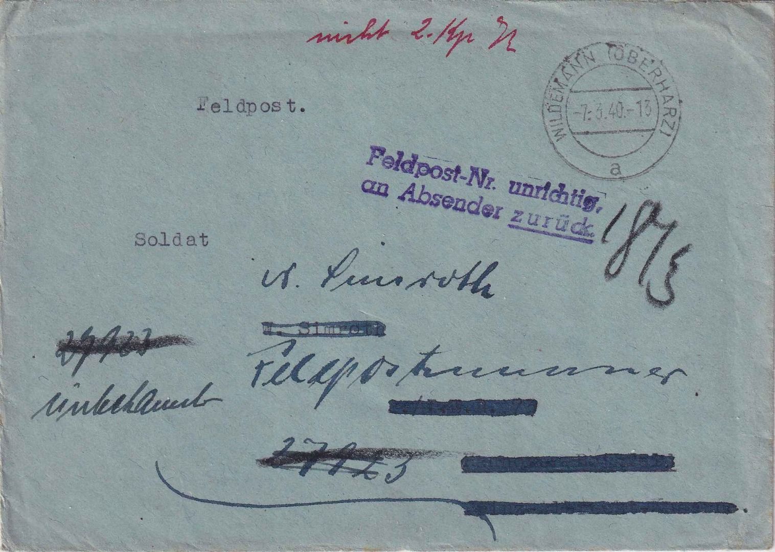 L2 "Feldpost-Nr. unrichtig/an Absender zurück" - ohne Inhalt - Stichwort: Clausthal-Zellerfeld