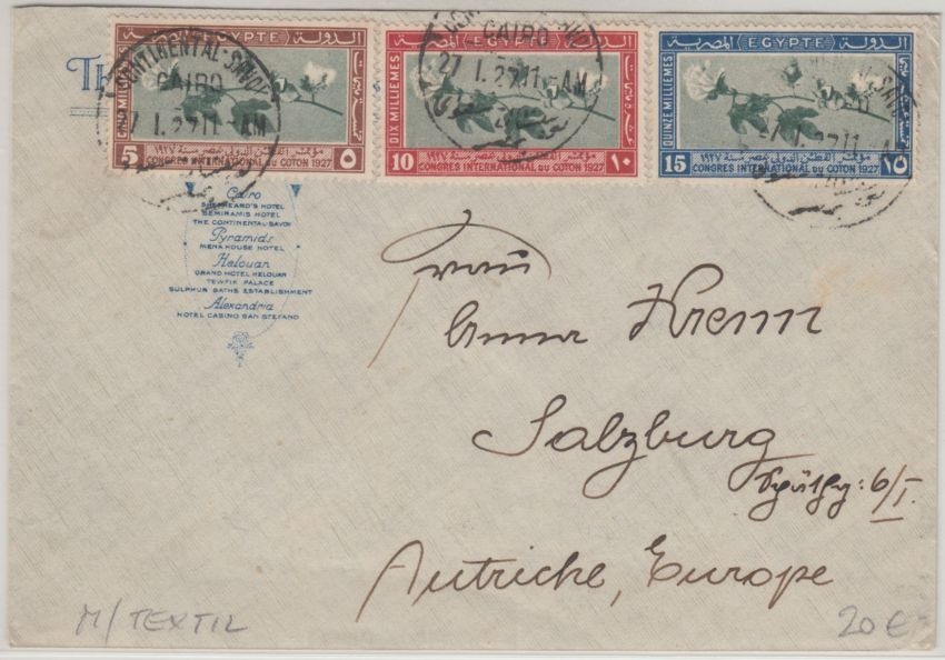 Ägypten - Congres International du Coton 1927 Satzbrief Continental Savoi Kairo