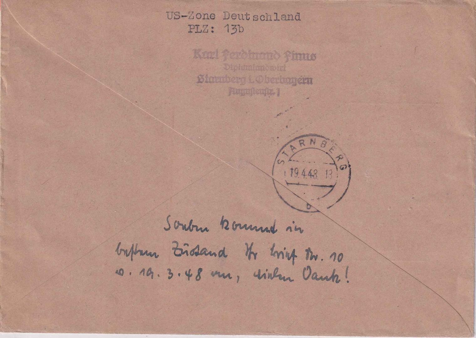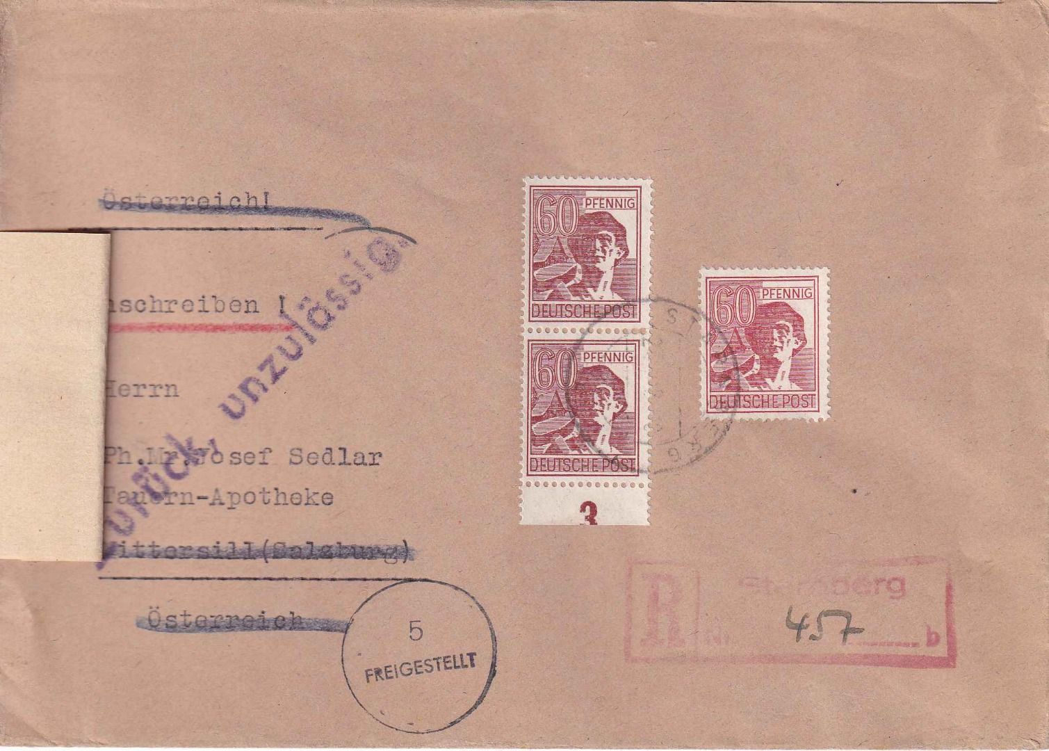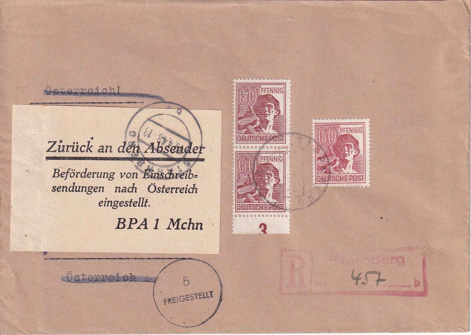L1 der österr. Zensur "Zurück unzulässig" und Klebezettel des BPA1 München - ohne Inhalt