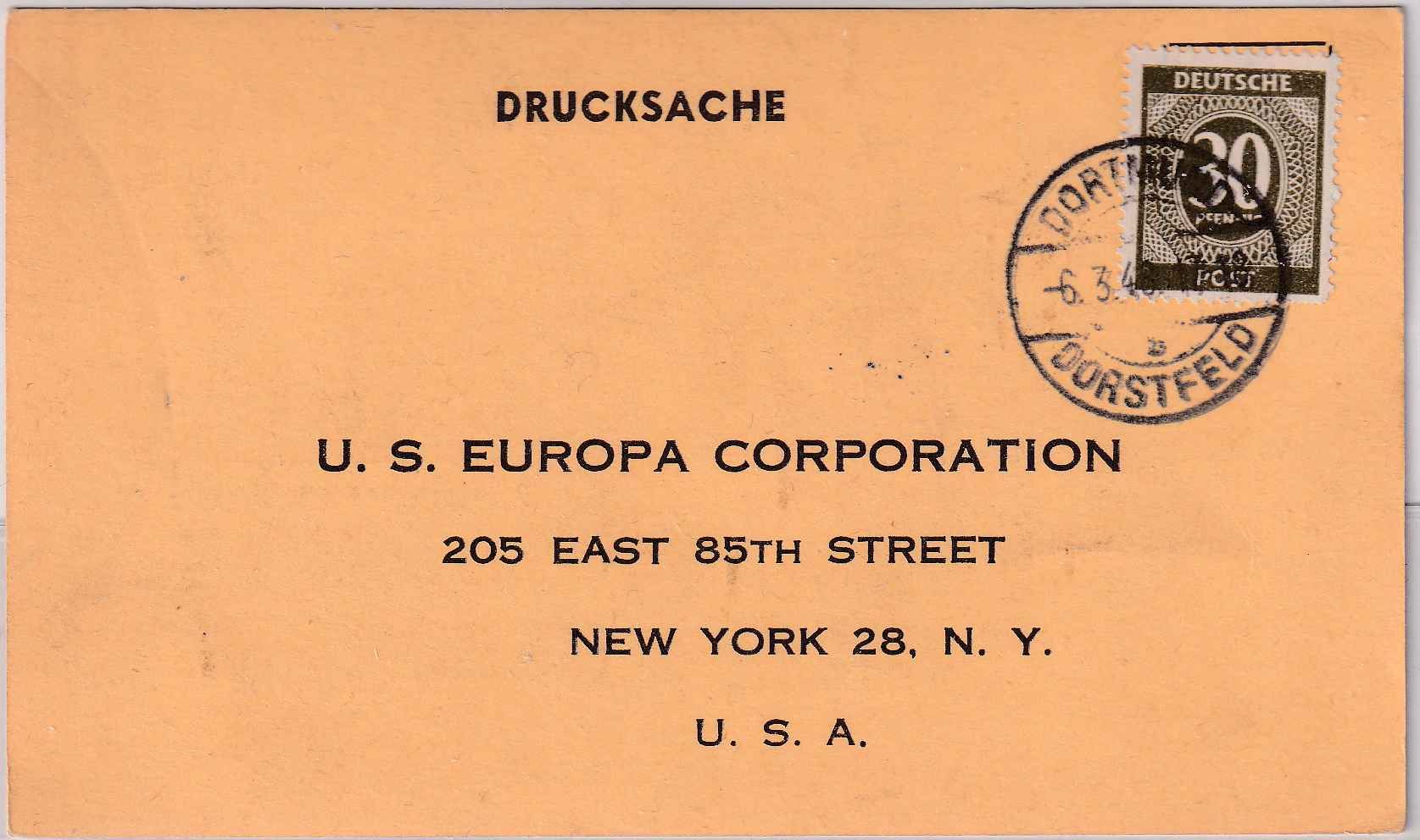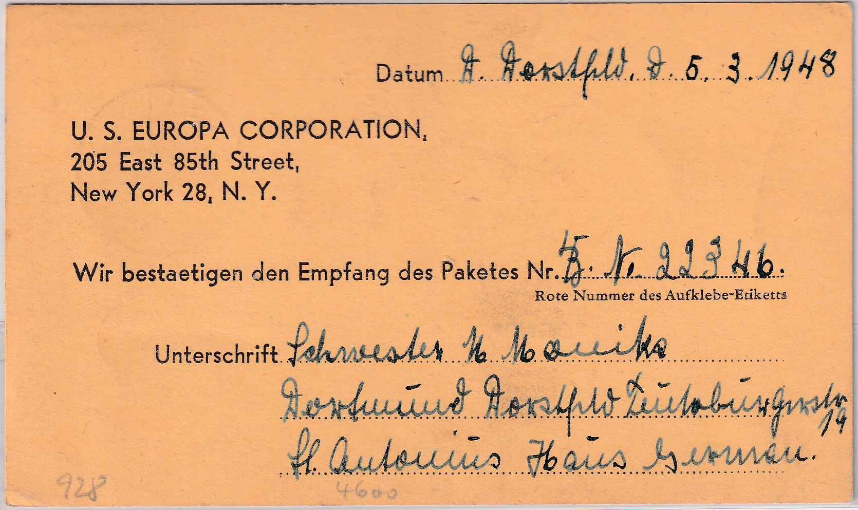 gelaufen n. New York - Empfangsbestätigung f. Liebesgabenpaket