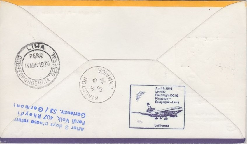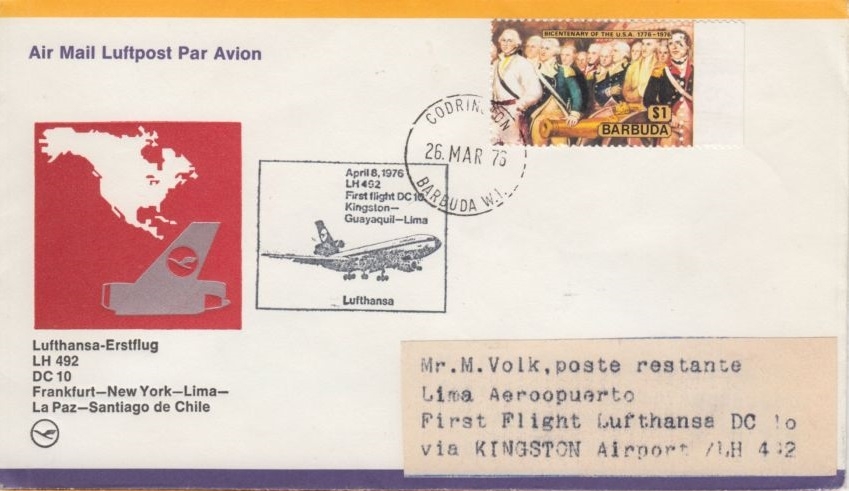 Barbuda - Zuleitungspost LH 1st-Flug Kingston - Lima 1976 1$ USA Unabhängigkeit