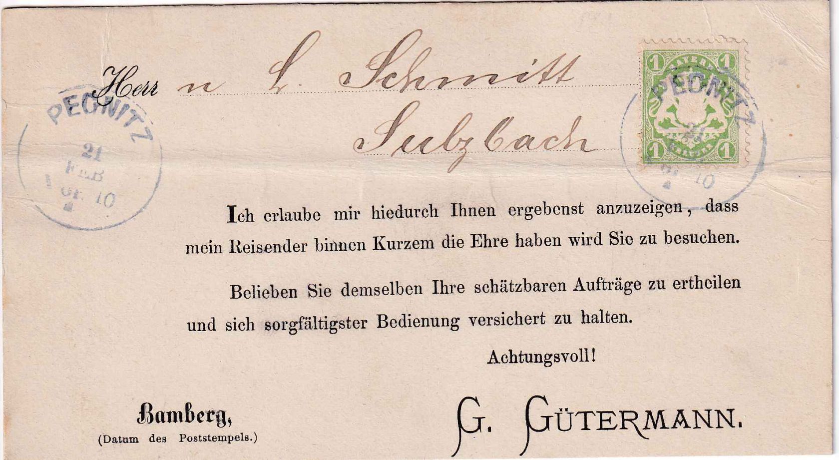 Bayern - 1 Kr. Wappen gez. Karte/Reiseavis K1 Pegnitz 21. FEB - Sulzbach