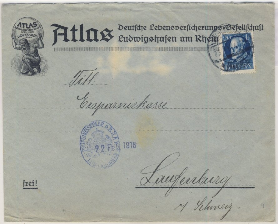 Bayern - 20 Pfg. Ludwig, Firmenbrief i.d. SCHWEIZ, Zensur, Ludwigshafen -