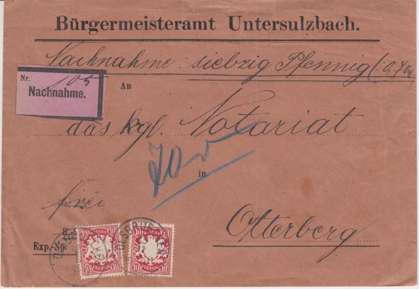 Vordruckkuvert d. Gemeinde Untersulzbach - ohne Inhalt - Stichwort: Otterbach, Otterberg