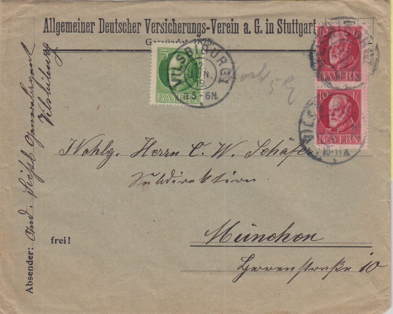 ursprünglich nur mit 2x10 Pfg. frankiert (V10-11) und am Nachmittag (5-6-N) noch mit 5 Pfg. nachfrankiert (hds. Vermerk "Noch 5 Pfg.") - ohne Inhalt