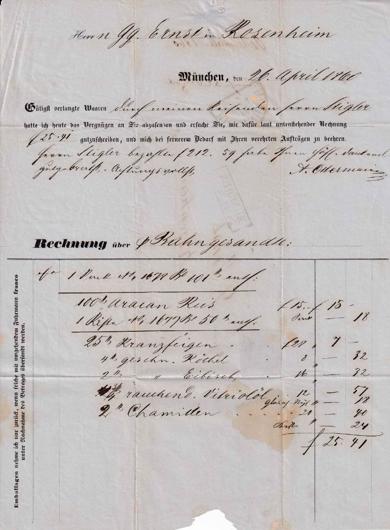 gelaufen n. Rosenheim - Marke oben beschnitten, sonst brei- bis überrandiges Stück vom linken Bogenrand - Brief mit Inhalt (Rechnung)