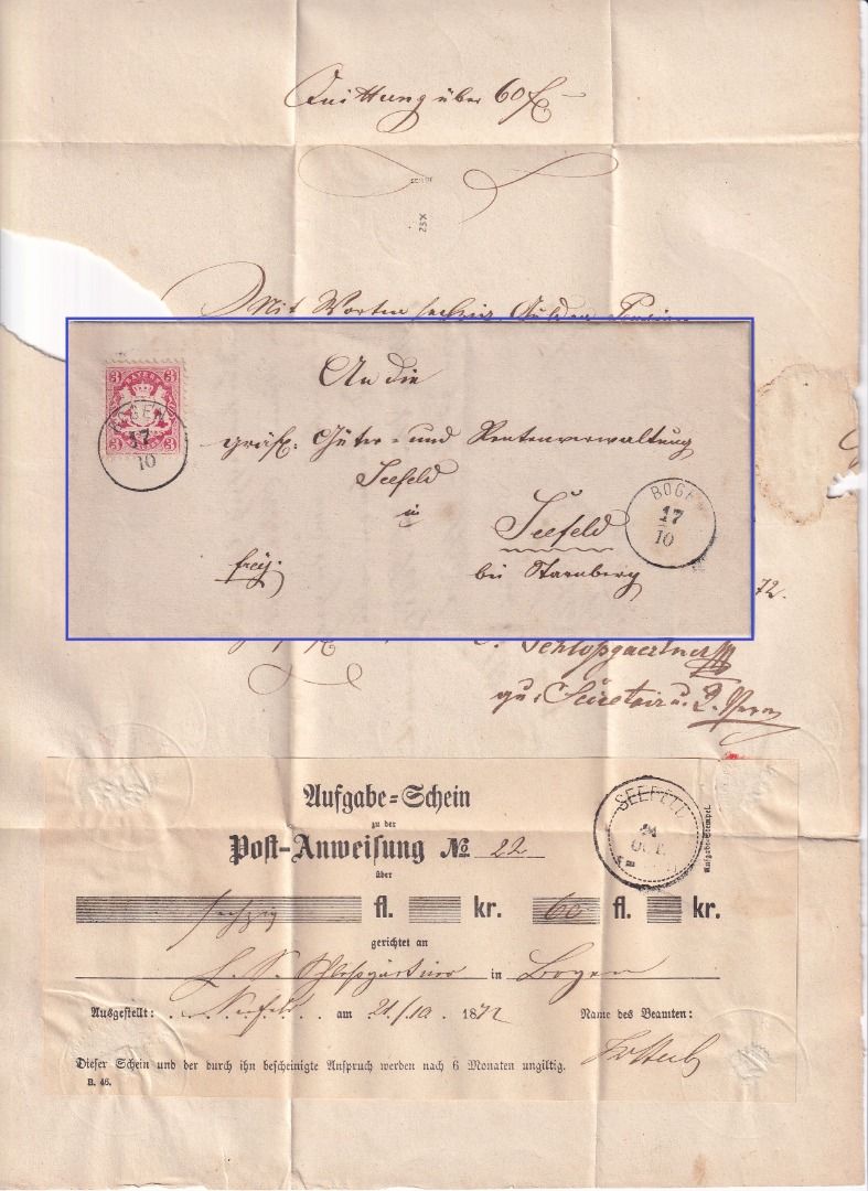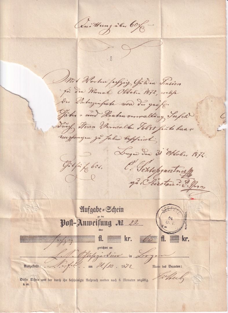 mit Inhalt (Aufgabeschein f. Postanweisung: Stempel Seefeld - "Quittung über 60 Gulden") - Fehlstelle durch Siegelausriss - gepr. Sem BPP