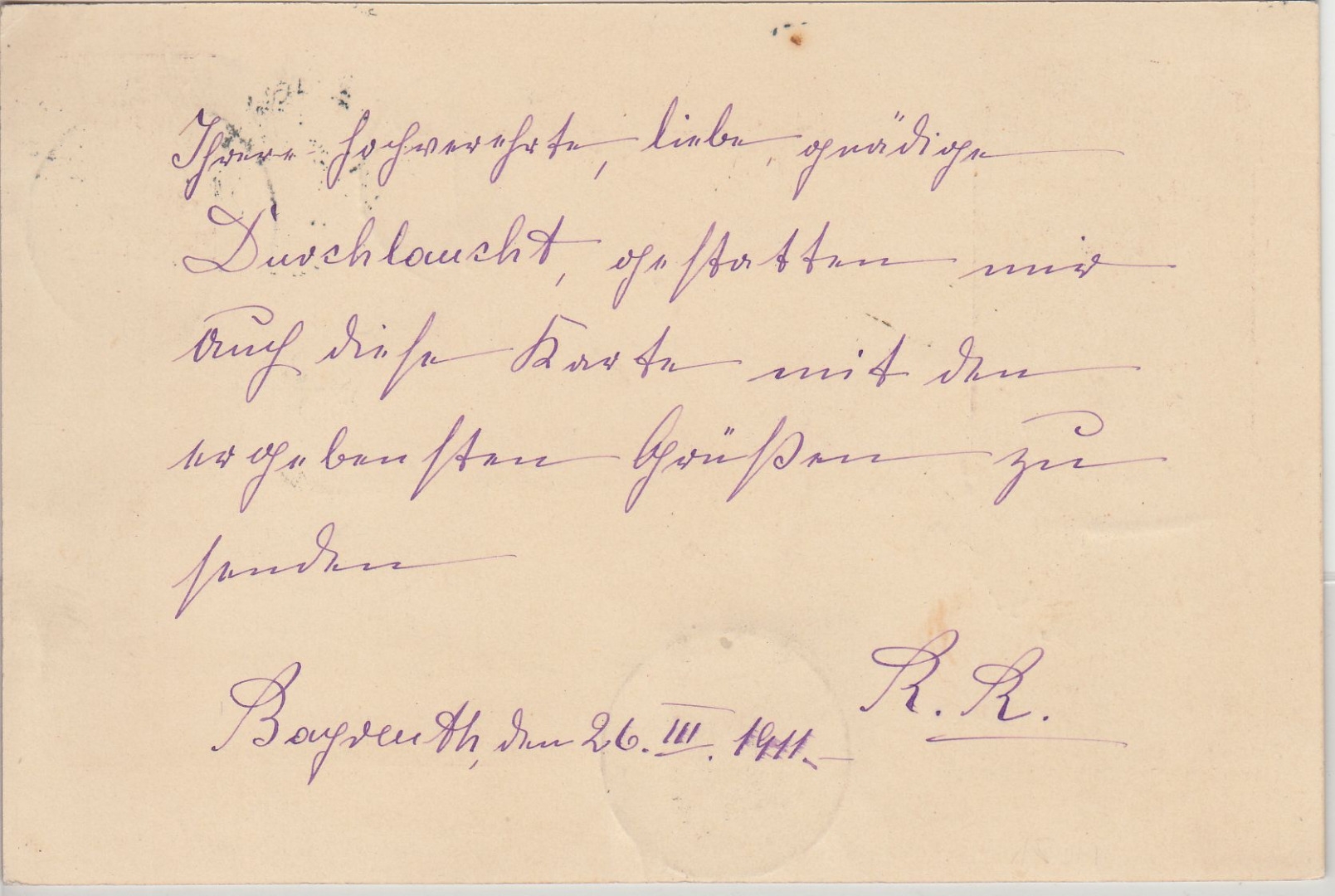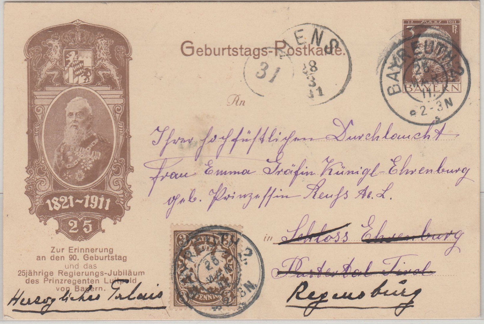 Weiterleitung n. Regensburg - adr. an Emma Gräfin Künigl geb. Prinzessin Reuss ä.L.