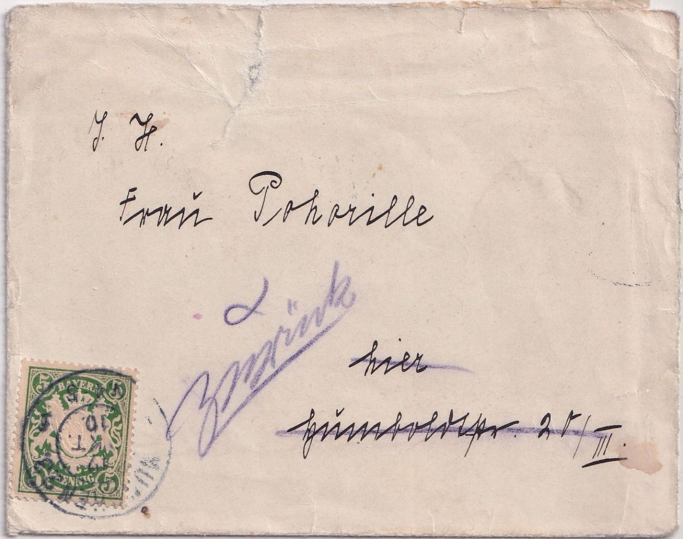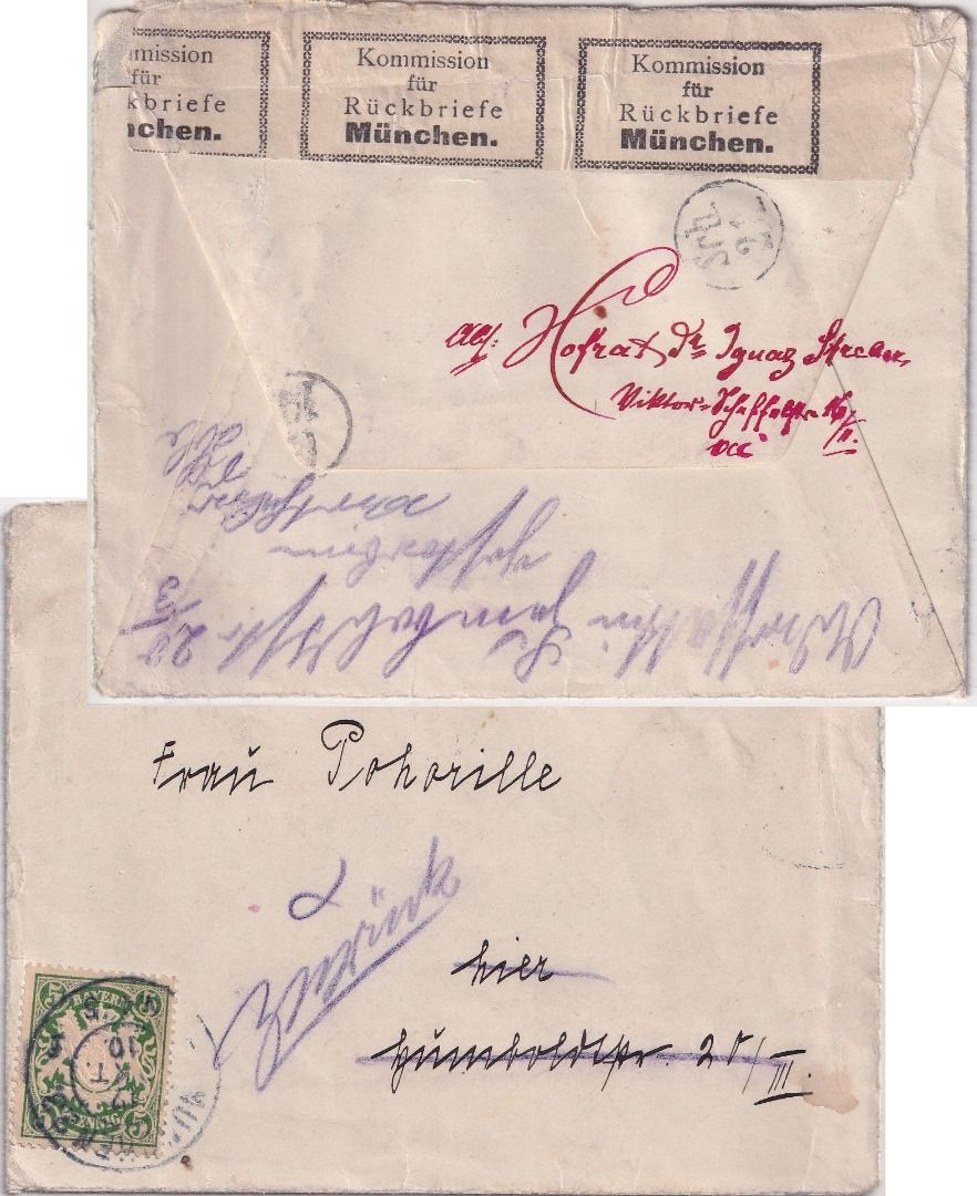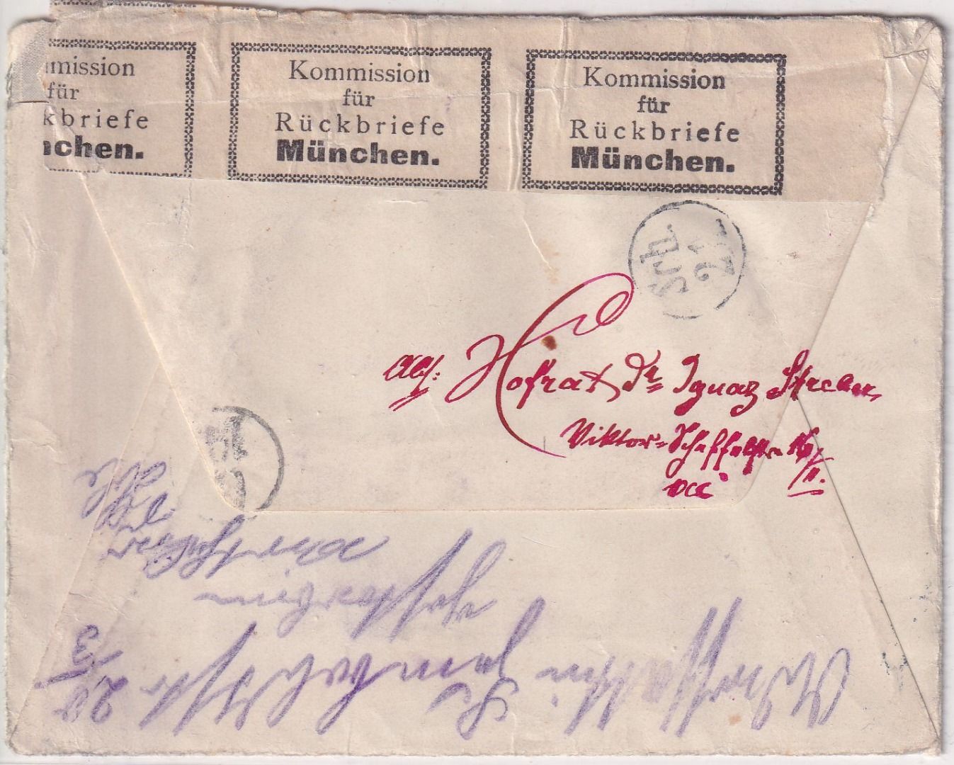 rs. hds. Vermerk "Adressatin....gestorben..." und 2 1/2 Verschlussvignetten der "Kommission für Rückbriefe München" (Weileder 32.3) und in typischer roter Tinte "Hofrat Dr. Ignaz Stecher..." - ohne Inhalt