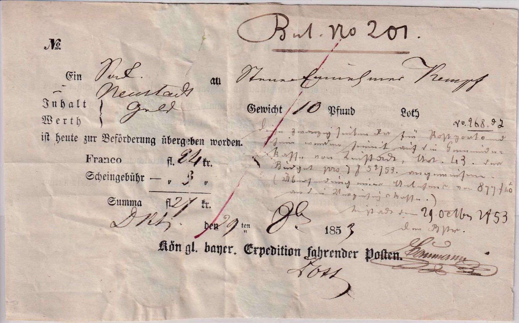 etwas links von der Mitte senkrecht zerrissen und zeitgenössisch repariert - handschr. Buchungsvermerk v. Neustadt 29. Okt. 1853