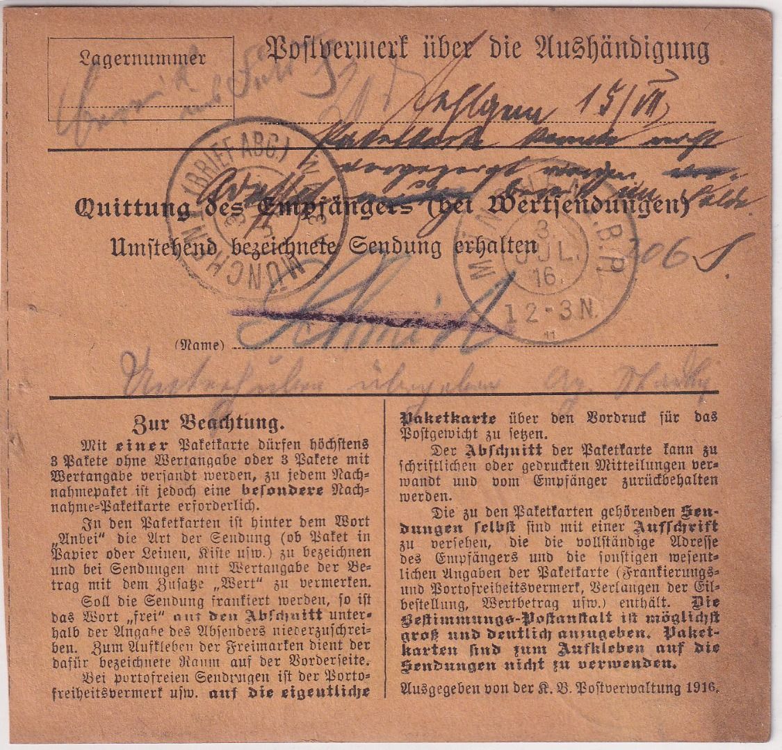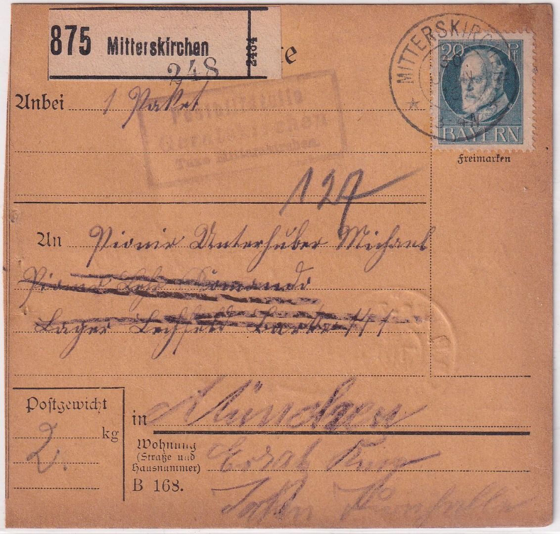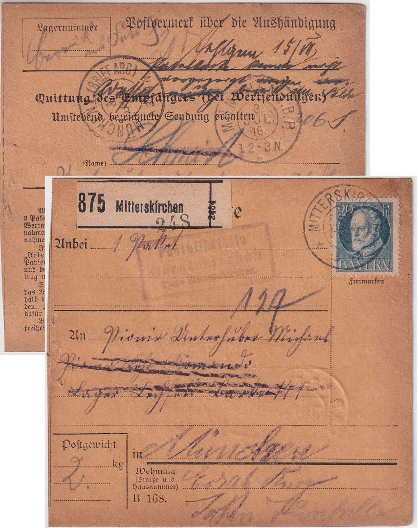 Bayern - Geratskirchen T. Mitterskirchen Posthilfstelle Ra3 Paketkarte 1916