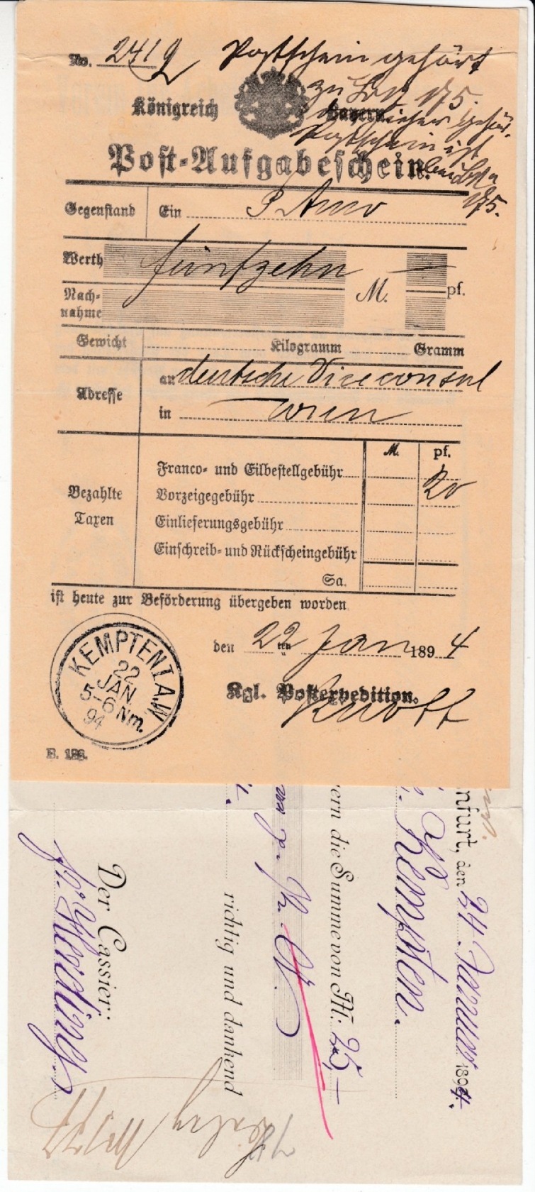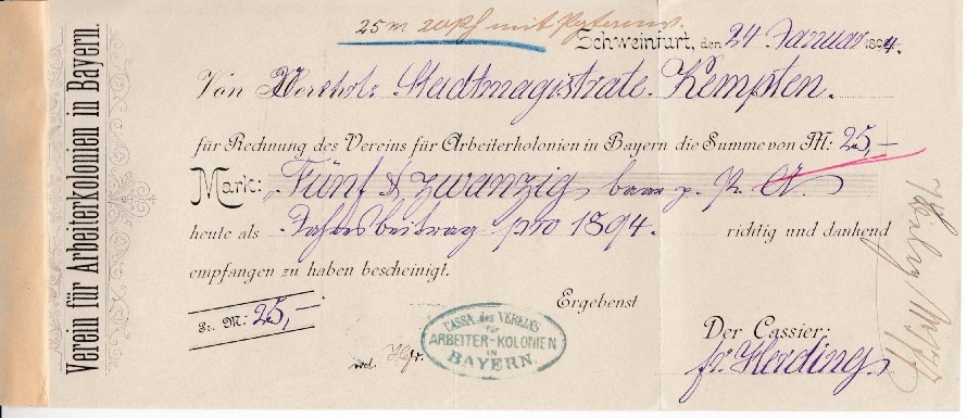 anhgd. Quittung d. "Verein f. Arbeiterkolonien in Bayern", datiert Schweinfurt 24.1.1894