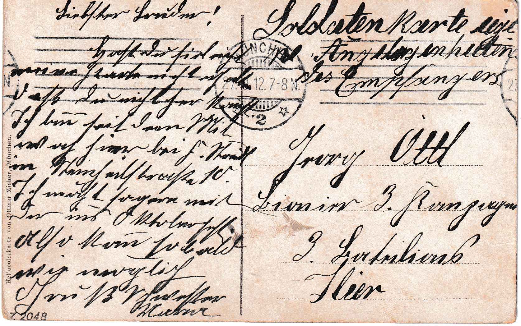 Verlag: O. Zieher - gelaufen als Soldatenkarte innerhalb München (ohne Nachporto !) - Karte bildseitig kl. Schürfung am rechten Rand