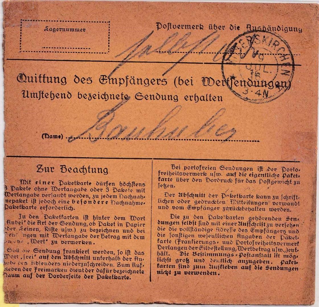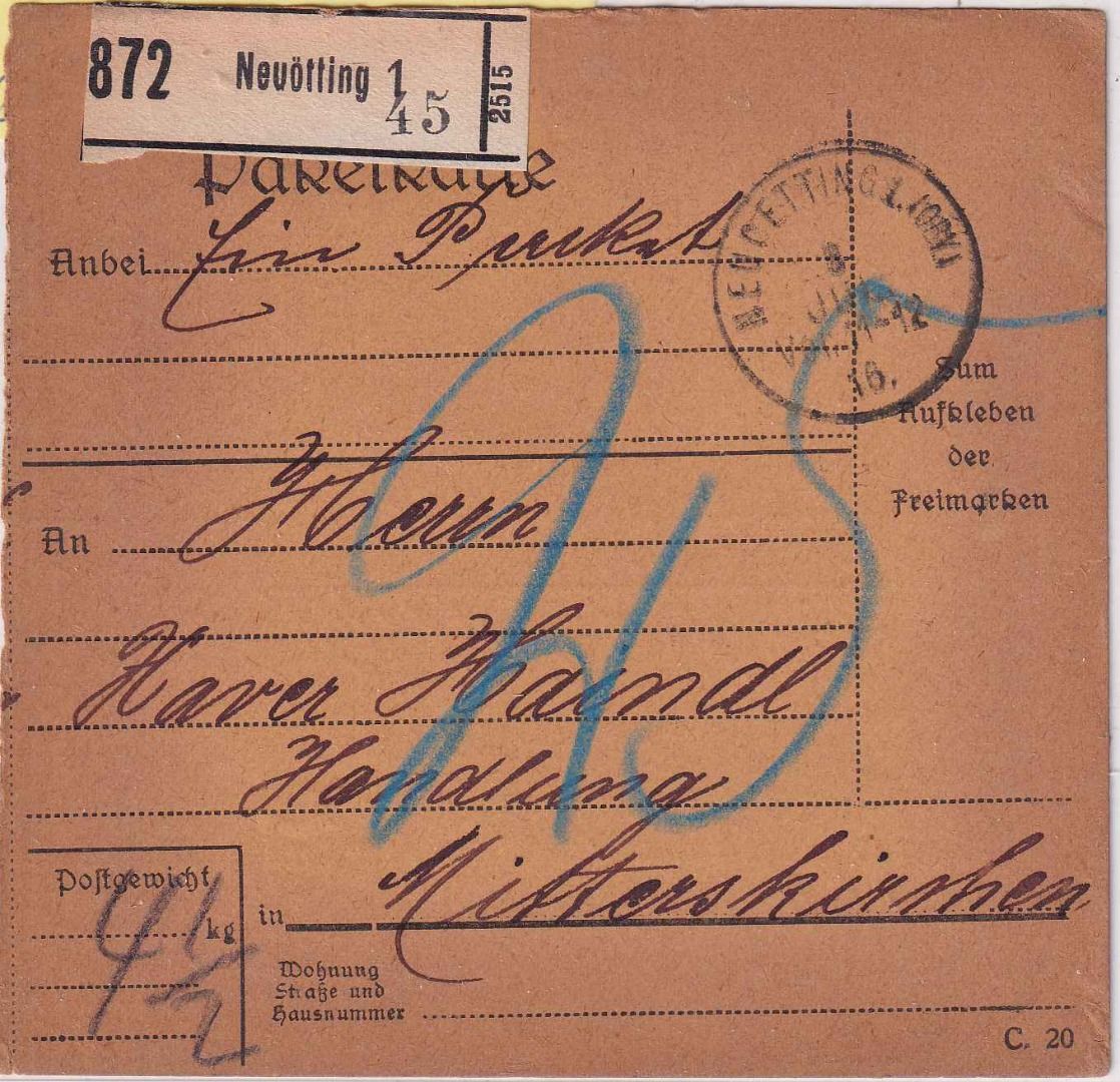 Bayern - Neuötting 1916 unfreie Paketkarte n. Mitterskirchen 25 Pfg. Nachporto