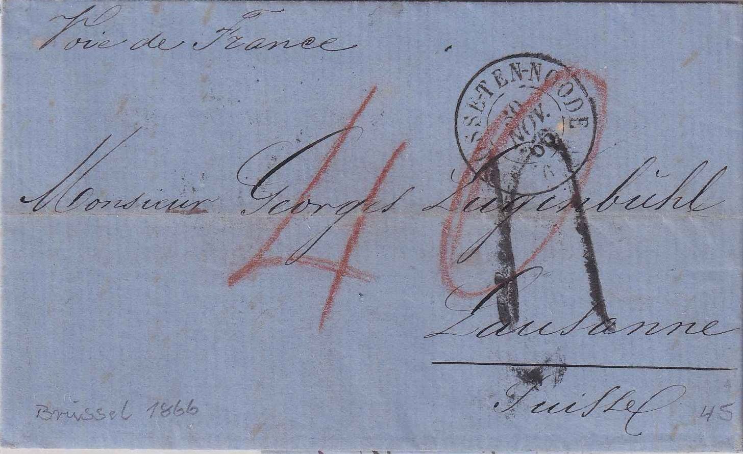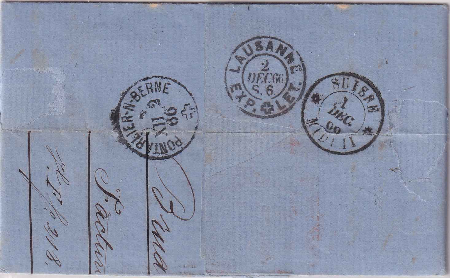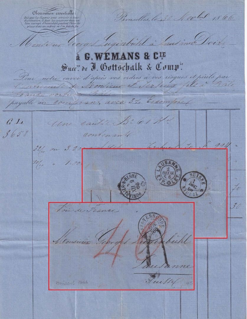 Leitvermerk über Frankreich - rs. Bahnpost-Stpl. Pontarlier-N-Berne - mit Inhalt