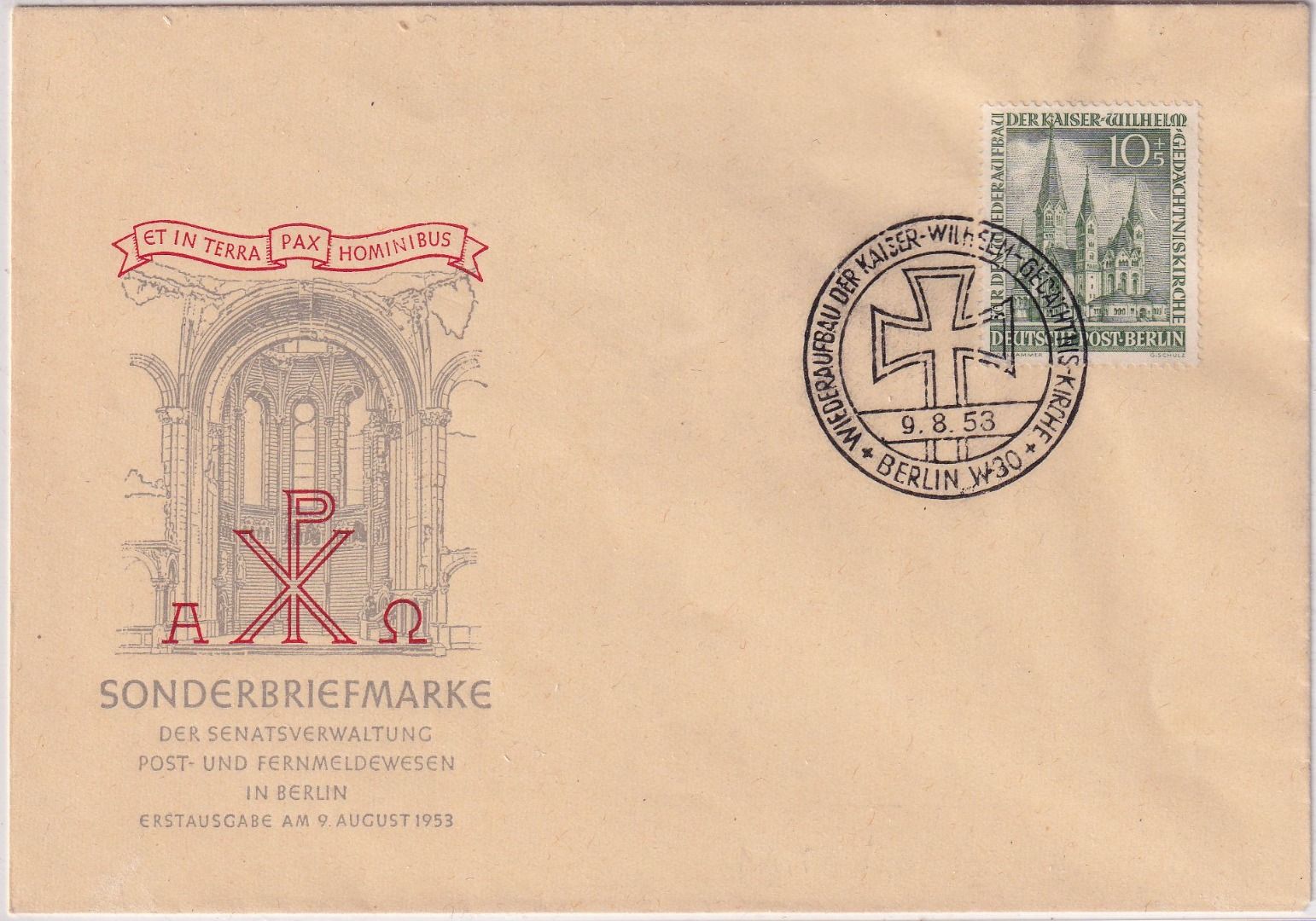 Berlin - 10 Pfg. Gedächtniskirche amtl. Schmuck-FDC ESST 9.8.53