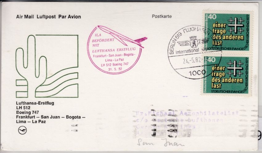 Zuleitungspost z. LH-Erstflug Frankfurt/M.-San Juan-Bogota-Lima-La Paz LH512 - Flugbestätigungsstempel