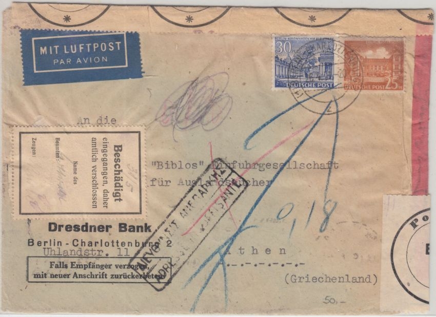 Retourvermerk - Aufkleber "Beschädigt eingegangen" - Verschlussstreifen Berlin SW11 - ein Beleg "mit Leben" - ohne Inhalt