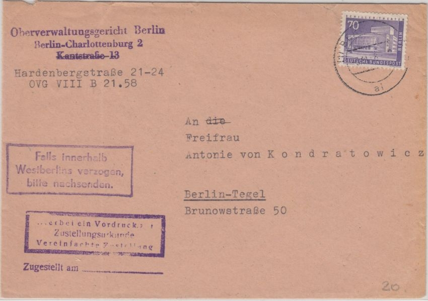 Berlin - 70 Pfg. Stadtbilder II Zustellurkunde Ortsbrief 1958