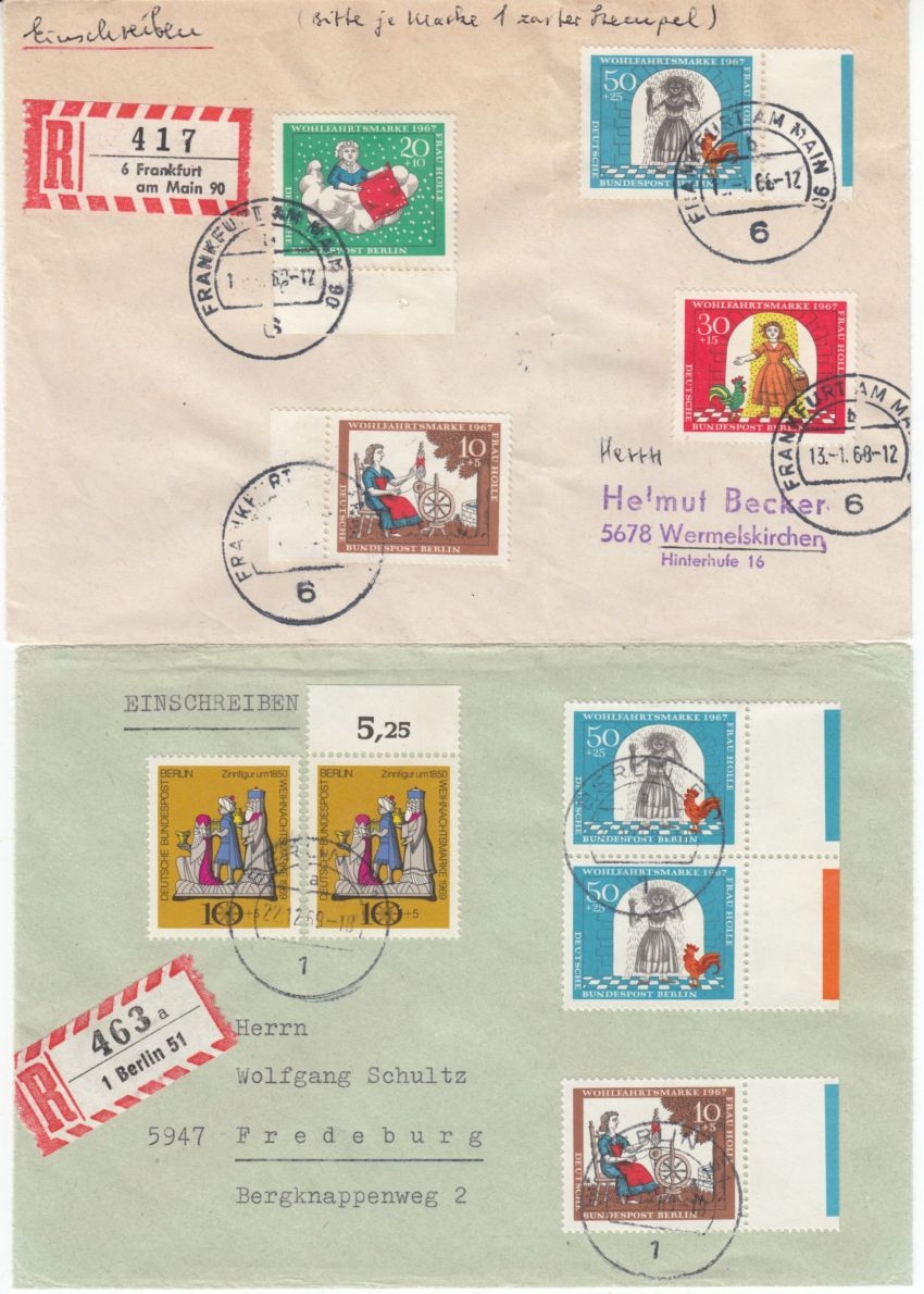 Berlin - Wofa 1967 Frau Holle 5 Briefe Farbränder Luftpost Einschreiben etc.