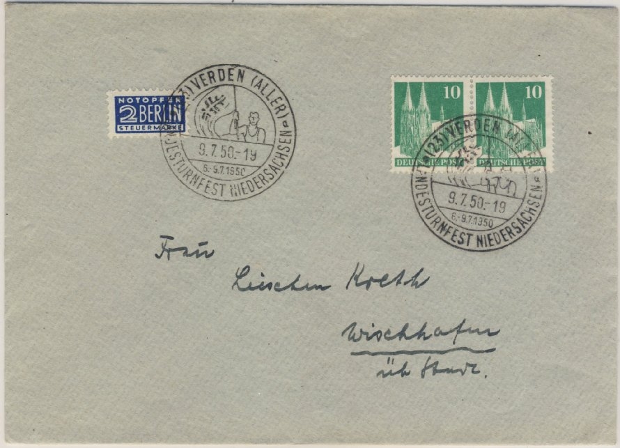 Bizone - Verden Landesturnfest Niedersachsen 1950 SST Brief n. Wischhafen