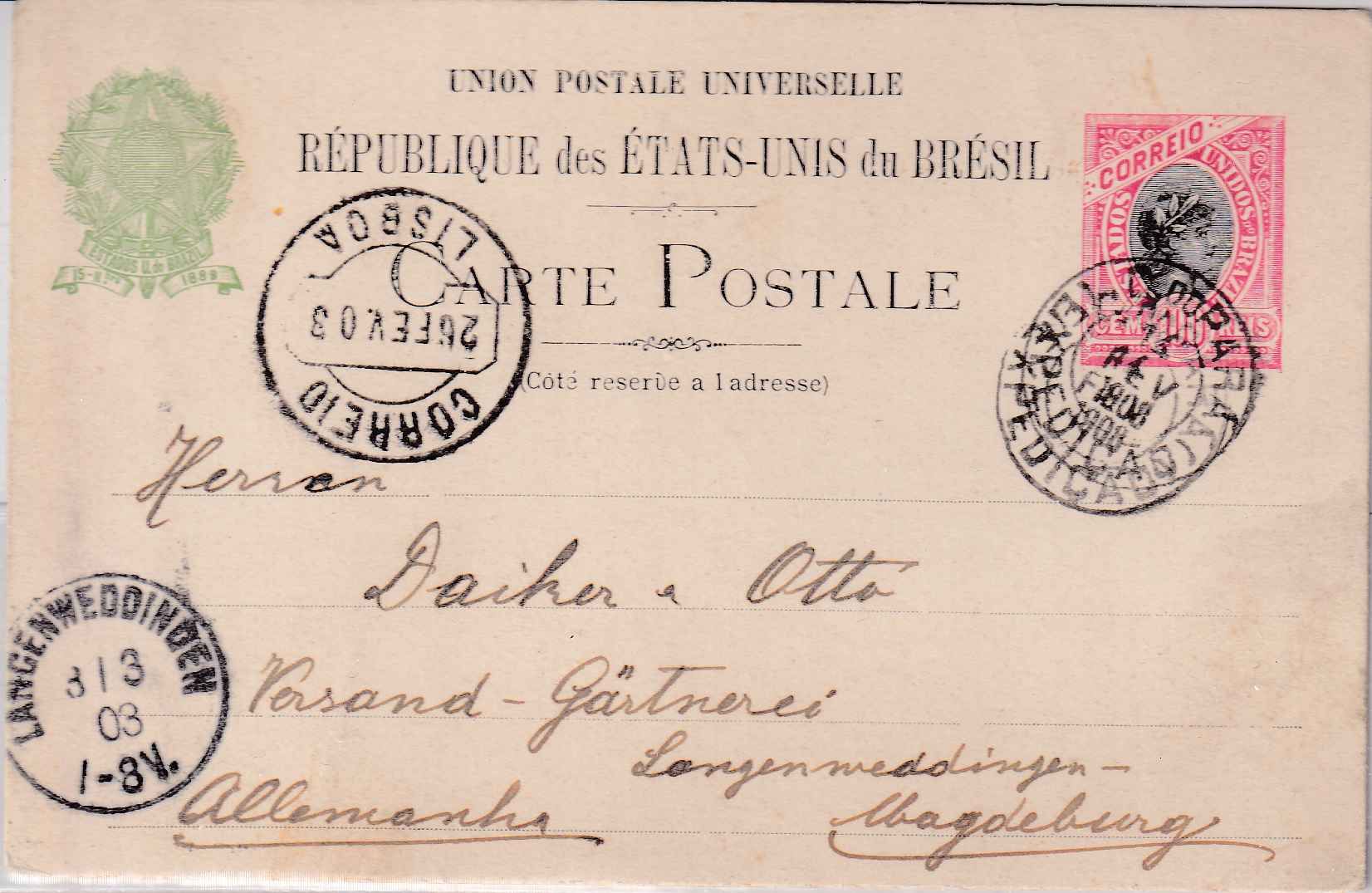 Brasilien - 100 R. Ganzsachenkarte Para - Lissabon - Langenweddingen 1903