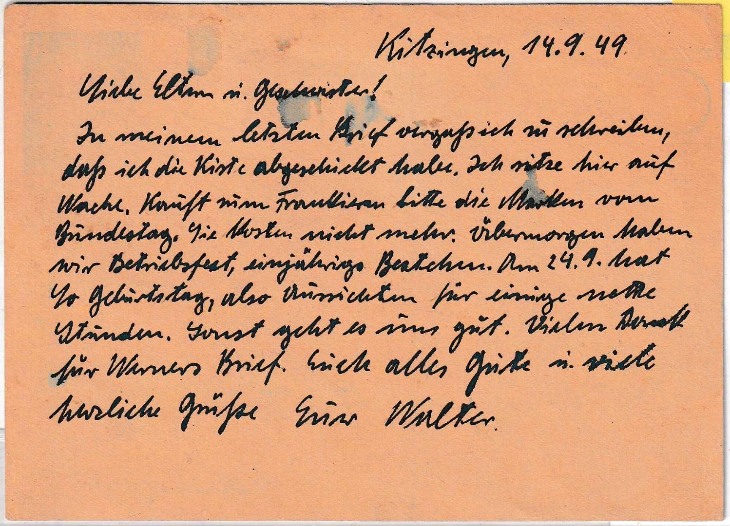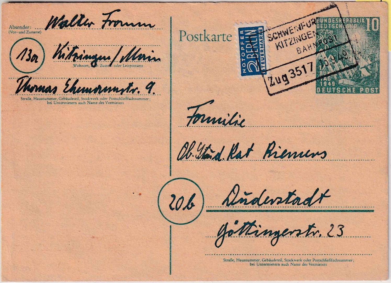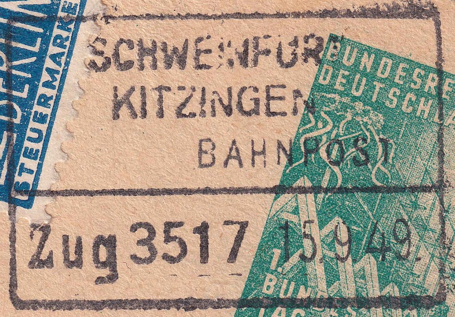 gelaufen v. Kitzingen n. Duderstadt - teilaptierter bayer. Bahnpost-Stempel