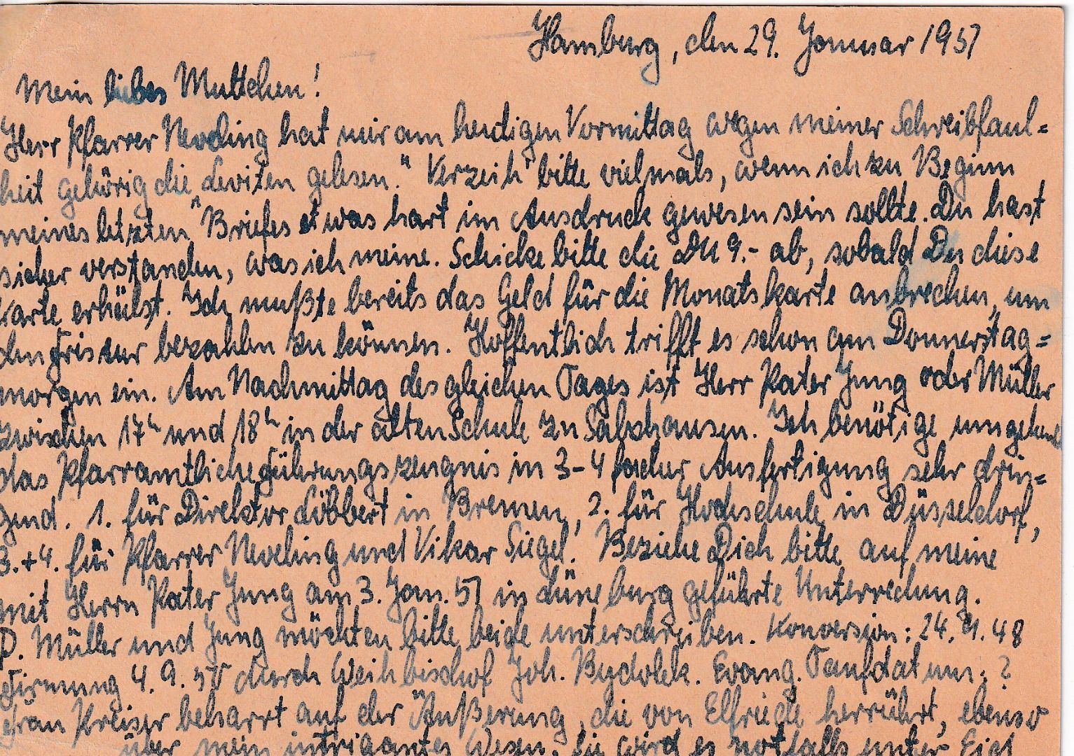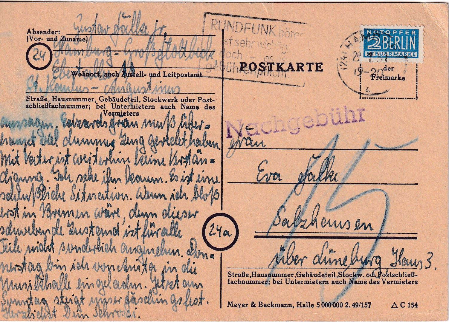 BRD - 2 Pfg. Notopfer unfrankierte Postkarte Hamburg - Salzhausen 1951 Nachporto