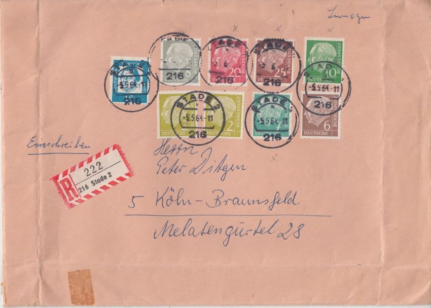 Kuvert Büge im Rand - 7, 10. 20 und 25 Pfg. Heuss I LUMOGEN !! - ohne Inhalt