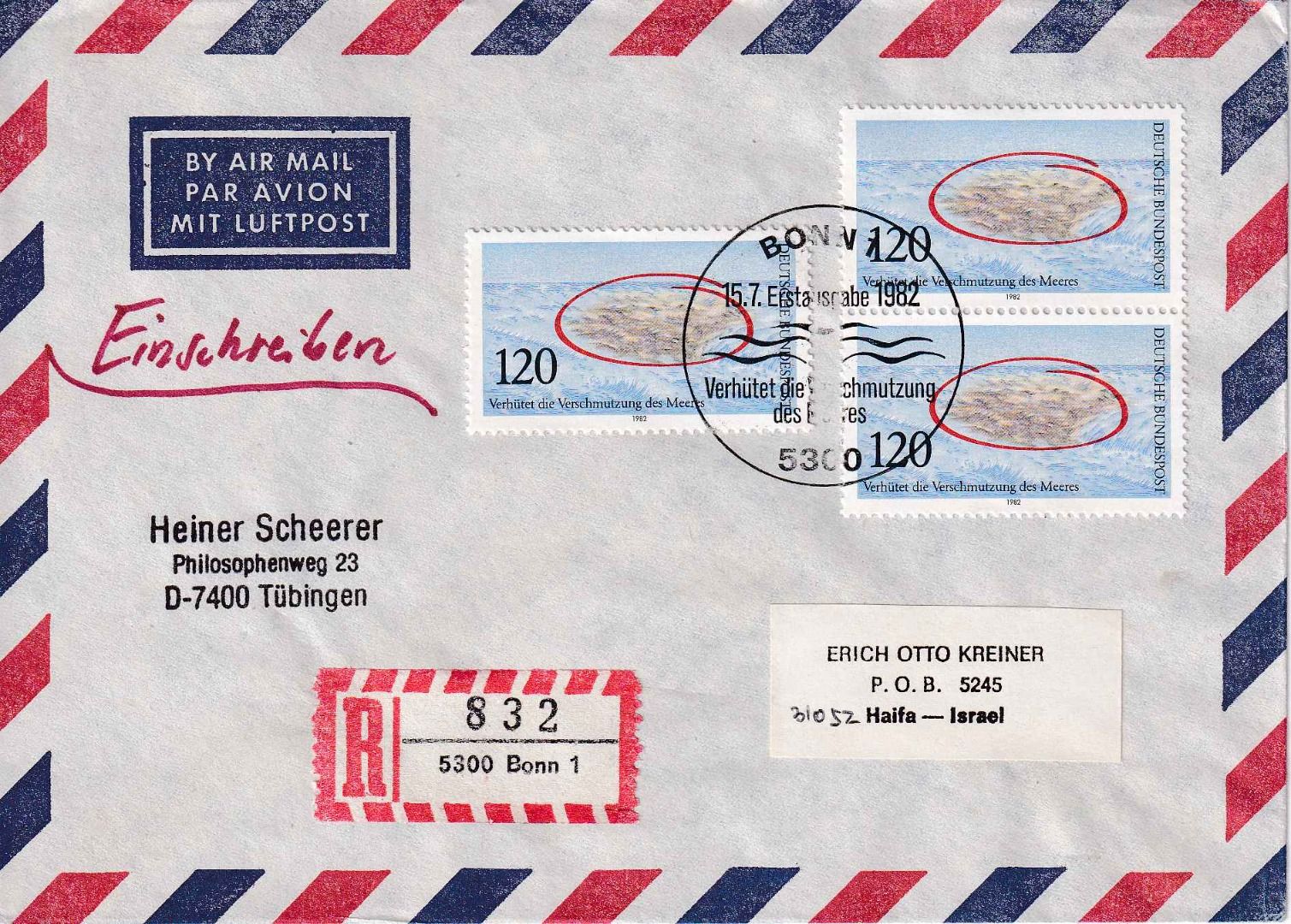 gelaufen v. Bonn n. Haifa - portorichtig: 120 Pfg. Brief bis 20g + 200 Pfg. Einschreibegebühr + 2x20 Pfg. Lupo je 5g = 360 Pfg. - rs. Ank.stempel - ohne Inhalt - Stichwort: Umweltschutz