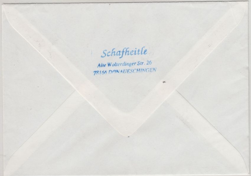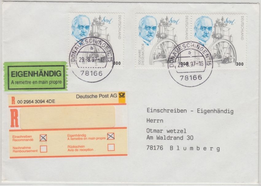 n. Blumberg 29.8.1997 - portorichtig: Brief >20g 200 Pfg. + 350 Pfg. Einschreibebeg. + 300 Pfg. Eigenhändig = 900 Pfg. - so nur 4 Tage möglich !!! (Markenausgabe 28.8. - Portoumstellung am 1.9.97) - sicherlich philatelistisch beeinflusst, aber dennoch dürfte es den Beleg/die Frankatur kaum geben, da i.d.R. kaum jemand darauf geachtet hat - ohne Inhalt