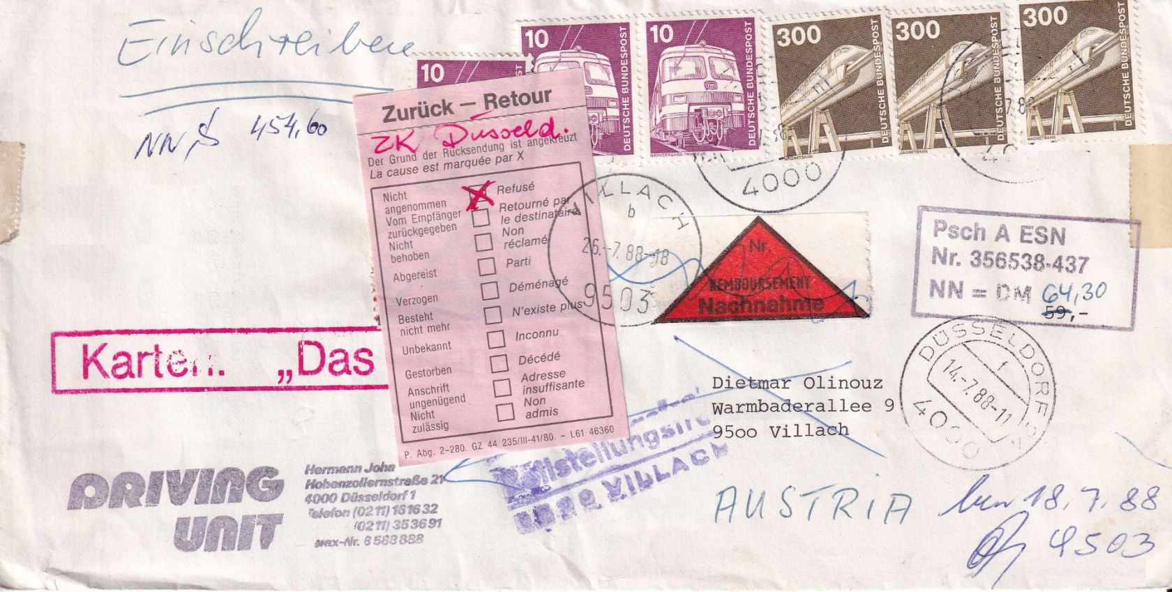 gelaufen v. Düsseldorf n. Villach - R-Zettel bei der Rücksendung entfernt (?) - ohne Inhalt