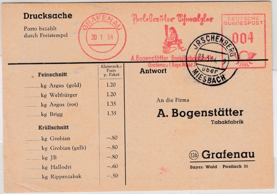 BRD - 4 Pfg. AFS "Perlesreuter Schmalzler", Drucksache/Antwortkarte Irschenberg