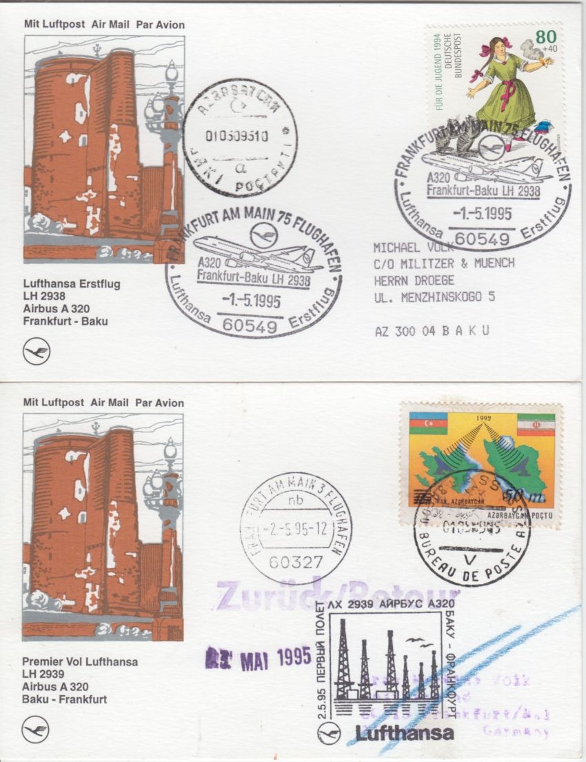 BRD/Aserbaidschan - Lufthansa Erstflug FFM-Baku + Baku-FFM 1995 2 Belege