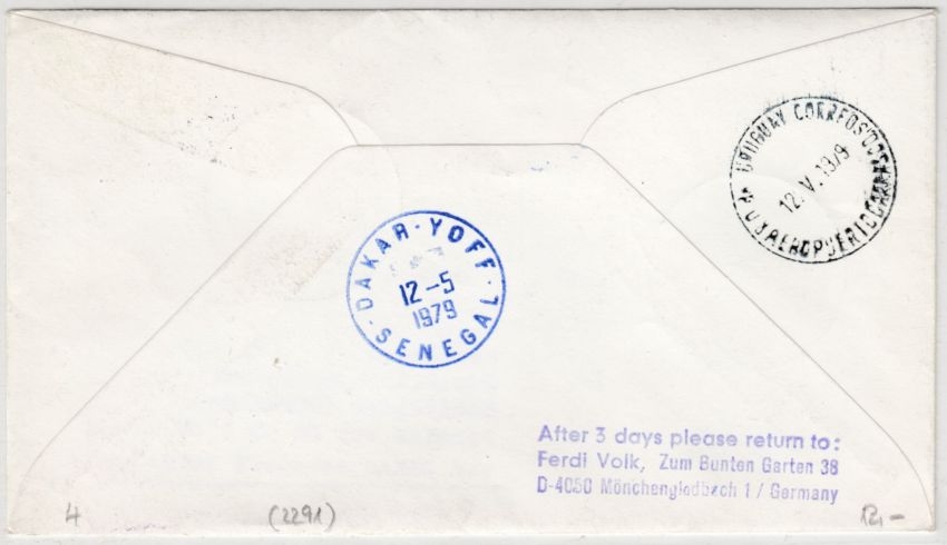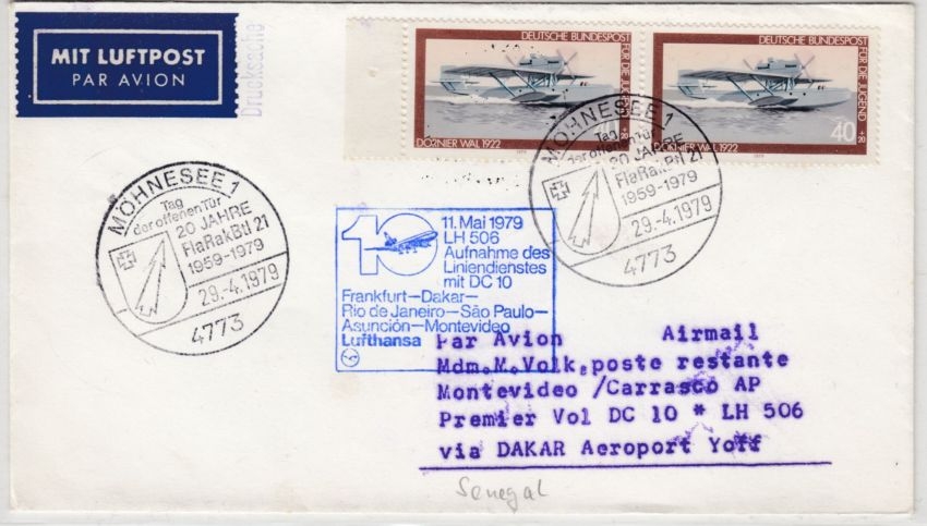 Zuleitungspost zum Erstflug Frankfurt-Montevideo auf die Etappe Dakar/SENEGAL - Montevideo - ungewöhnliche Kombination und modernes Schmuckstück f.d. Heimatsammlung - ohne Inhalt
