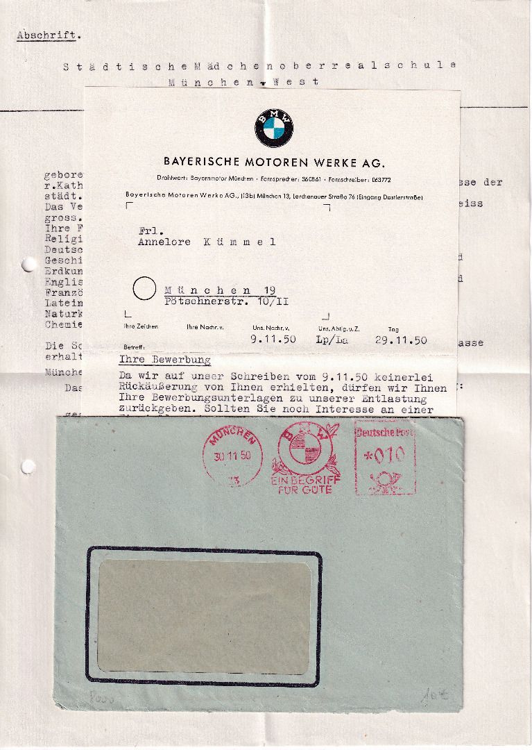 Inhalt: Schreiben der BMW AG mit Bewerbungsnunterlagen