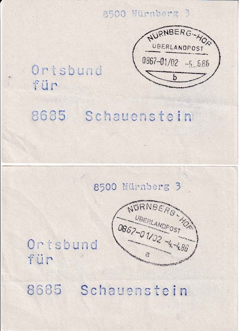 BRD - Nürnberg/Hof Überlandpost 0867-01/02 zwei Vorbundzettel Hof 1 1986