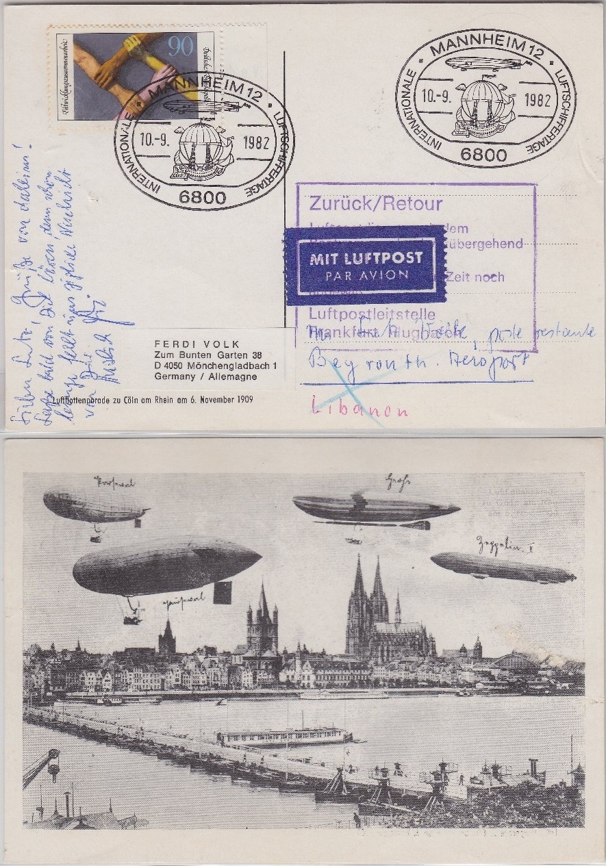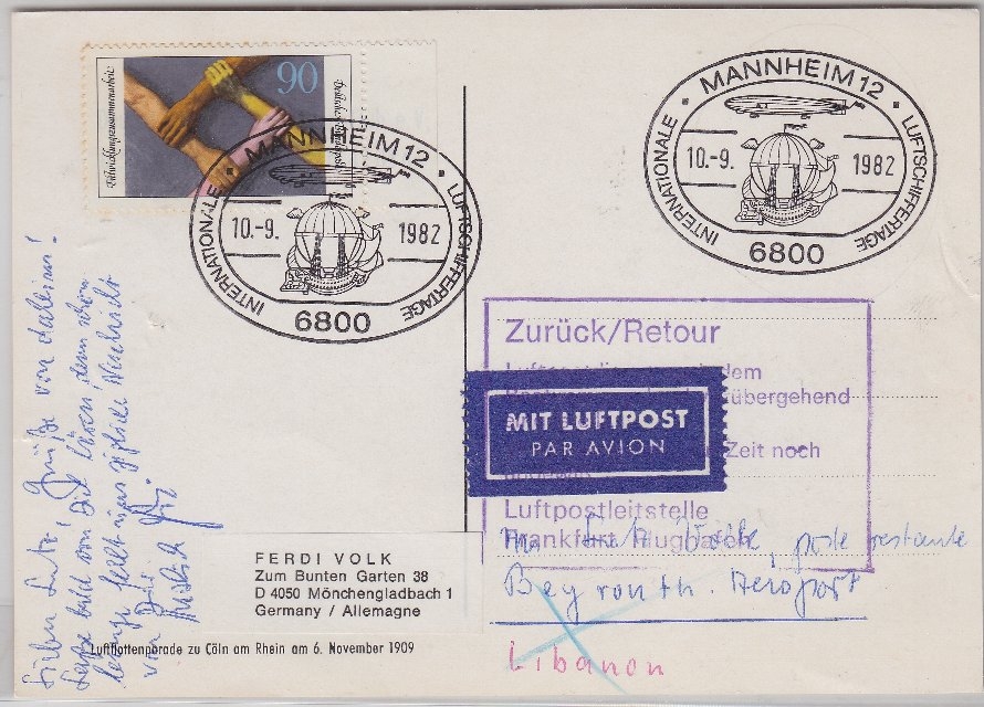 BRD/Postsperre - Karte n. LIBANON SST Mannheim Luftschiffertage - Beyrouth 1982